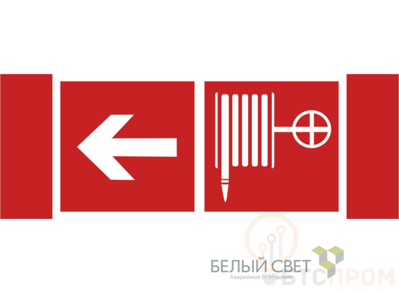 Знак безопасности "Указатель движения к пожарному крану налево" габаритные размеры 340х125 мм, фактические размеры 250х125 мм, сигнальный цвет - красный, контрастный цвет - белый