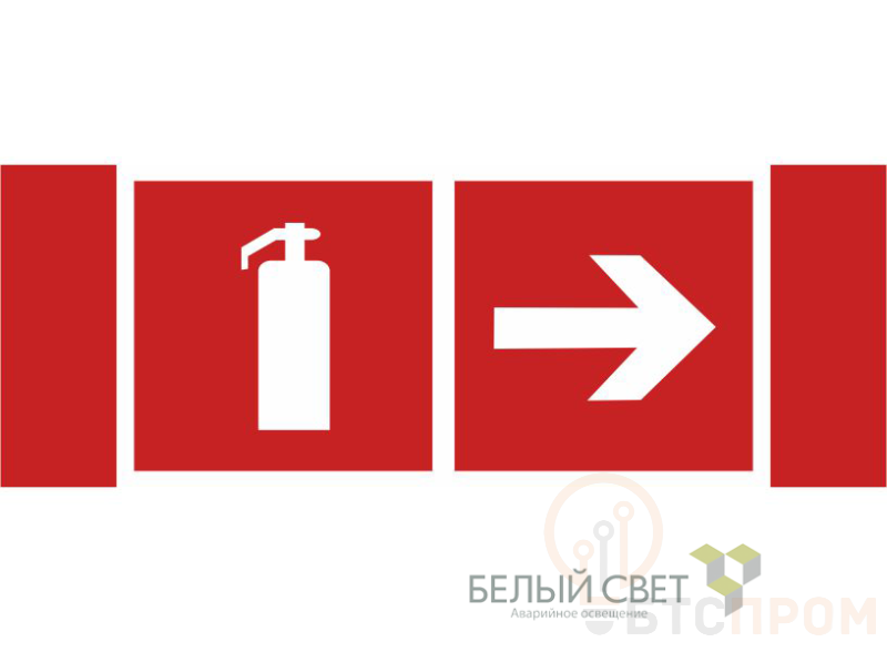 Знак безопасности "Указатель движения к огнетушителю направо" габаритные размеры 340х125 мм, фактические размеры 250х125 мм, сигнальный цвет - красный, контрастный цвет - белый