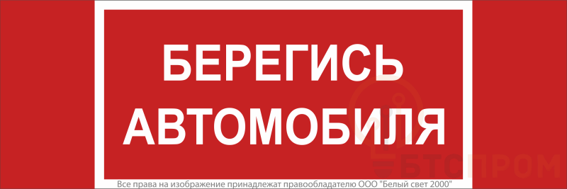 Знак безопасности "Берегись автомобиля" габаритные размеры 340х125 мм, фактические размеры 250х125 мм, сигнальный цвет - красный, контрастный цвет - белый