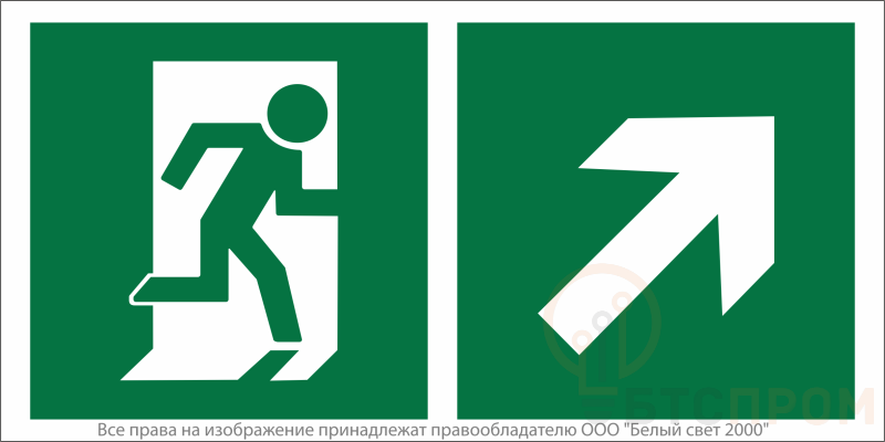 Знак безопасности "Направление к эвакуационному выходу направо вверх" габаритные размеры 600х300 мм, фактические размеры 600х300 мм, сигнальный цвет - зеленый, контрастный цвет - белый
