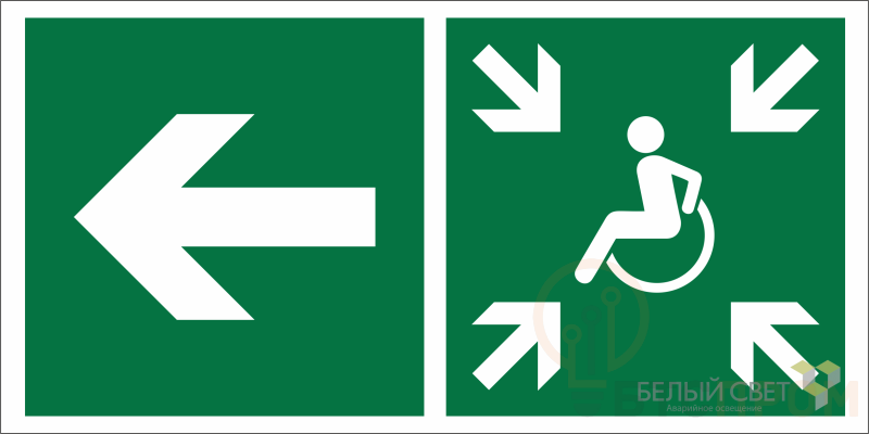Знак безопасности "Направление движения к пункту сбора (безопасной зоне) МГН налево" габаритные размеры 600х300 мм, фактические размеры 600х300 мм, сигнальный цвет - зеленый, контрастный цвет - белый
