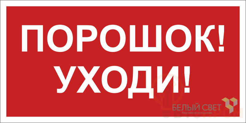 Знак безопасности "Порошок – уходи!" габаритные размеры 600х300 мм, фактические размеры 600х300 мм, сигнальный цвет - красный, контрастный цвет - белый
