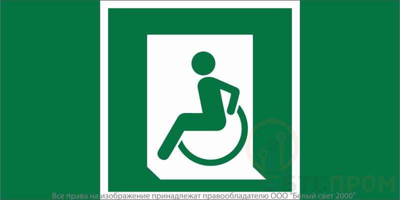 Знак безопасности "Выход для МГН здесь (левосторонний)" габаритные размеры 700х350 мм, фактические размеры 350х350 мм, сигнальный цвет - зеленый, контрастный цвет - белый