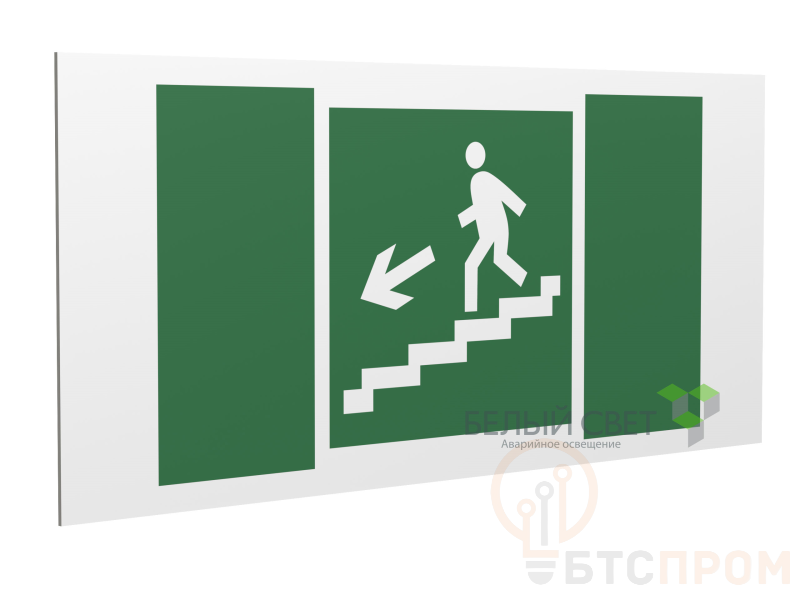 Знак безопасности "Направление к эвакуационному выходу по лестнице вниз", габаритные размеры 360х160 мм, фактические размеры 280х140 мм, сигнальный цвет - зеленый, контрастный цвет - белый