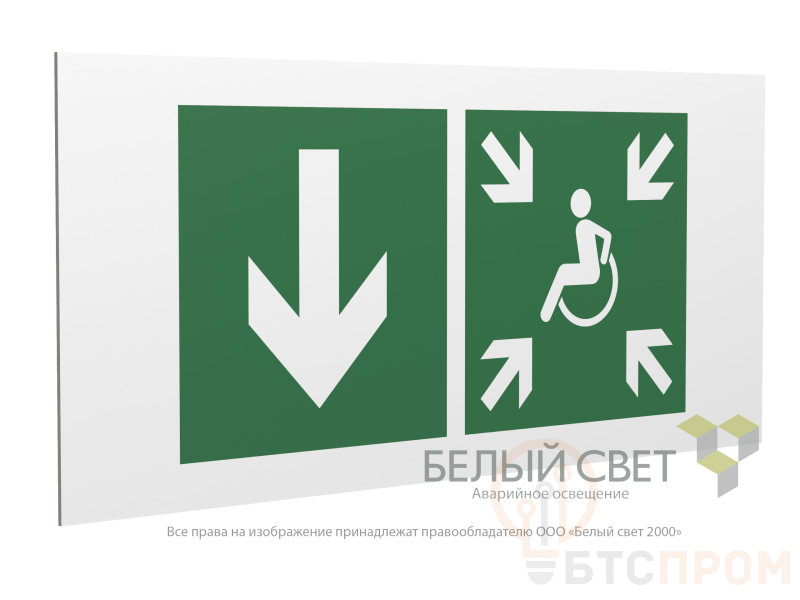 Знак безопасности "Указатель двери пункта сбора (безопасной зоны) МГН (левосторонний)", габаритные размеры 360х160 мм, фактические размеры 280х140 мм, сигнальный цвет - зеленый, контрастный цвет - белый