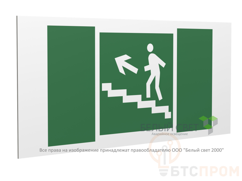 Знак выполнен в строгом соответствии с требованиями действующих стандартов. Он имеет четкое графическое изображение (пиктограмму) бегущего человека, стрелки, указывающей направление движения вверх и налево, а также символа лестницы. Надпись "ЭВАКУАЦИОННЫЙ ВЫХОД" легко читается и однозначно трактуется в экстренной ситуации. Основной материал изготовления — прочный пластик (полипропилен), обеспечивающий долговечность и устойчивость к износу.