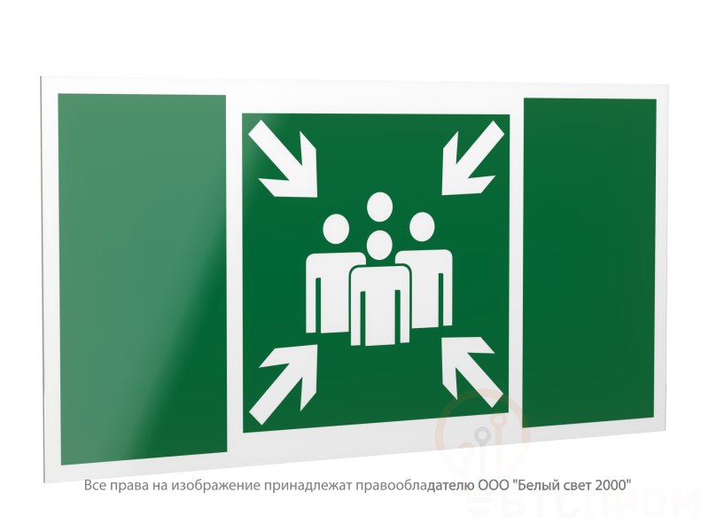 Сфера прымянення знака шырокая: ён незаменны для разметкі на прадпрыемствах, у офісных будынках, гандлёвых цэнтрах, навучальных установах і медыцынскіх установах. Яго галоўная задача — вызначыць і пазначыць месца, дзе людзі павінны сабрацца ў выпадку экстранай сітуацыі, такой як пажар, землятрус альбо іншая небяспека, што дапамагае арганізаваць эвакуацыю і правільна размеркаваць патоку людзей. Знак адпавядае дзеючым тэхнічным нарматыўным прававым актам і можа быць выкарыстаны для камплектавання сістэм пажарнай бяспекі і грамадзянскай абароны.