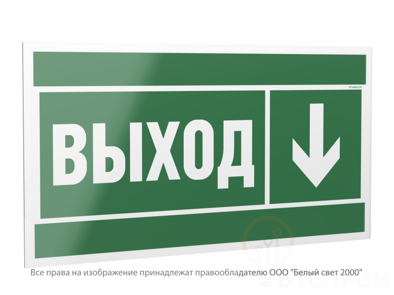 Знак выполнен в белом цвете и обладает свойством длительного послесвечения. Он изготовлен из прочного пластика, устойчивого к воздействию влаги и умеренных механических нагрузок. Лицевая поверхность покрыта защитной пленкой, предотвращающей выцветание и истирание графики. Четкое пиктографическое изображение и стрелка, указывающая направление движения вниз, легко считываются с большого расстояния.