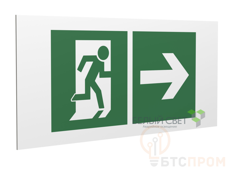 Знак безопасности "Направление к эвакуационному выходу направо", габаритные размеры 418х218 мм, фактические размеры 400х200 мм, сигнальный цвет - зеленый, контрастный цвет - белый