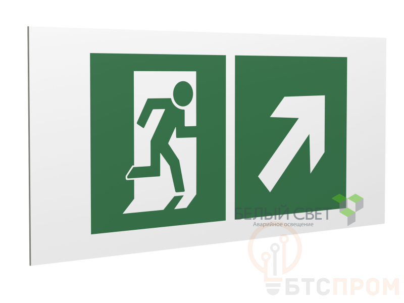 Знак безопасности "Направление к эвакуационному выходу направо вверх", габаритные размеры 418х218 мм, фактические размеры 400х200 мм, сигнальный цвет - зеленый, контрастный цвет - белый
