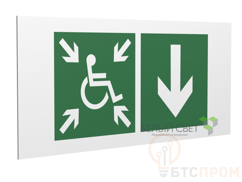 Знак безопасности "Указатель двери пункта сбора (безопасной зоны) МГН (правосторонний)", габаритные размеры 418х218 мм, фактические размеры 400х200 мм, сигнальный цвет - зеленый, контрастный цвет - белый