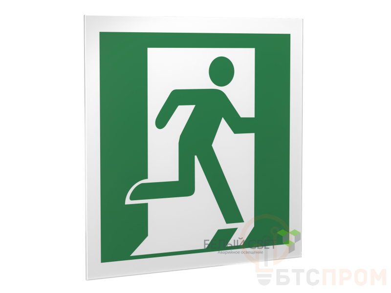 Знак безопасности "Выход здесь (правосторонний)", габаритные размеры 150х161 мм, фактические размеры 150х150 мм, сигнальный цвет - зеленый, контрастный цвет - белый