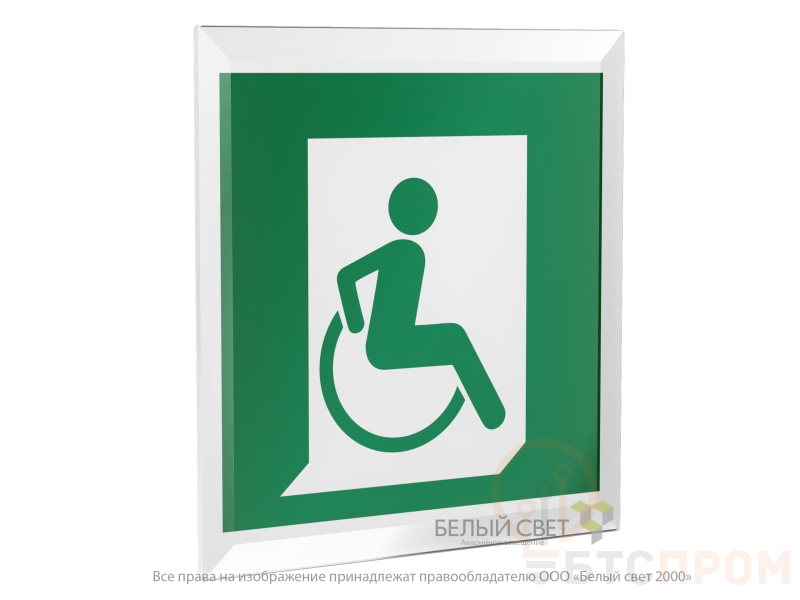 Знак безопасности "Выход для МГН здесь (правосторонний)", габаритные размеры 150х161 мм, фактические размеры 150х150 мм, сигнальный цвет - зеленый, контрастный цвет - белый