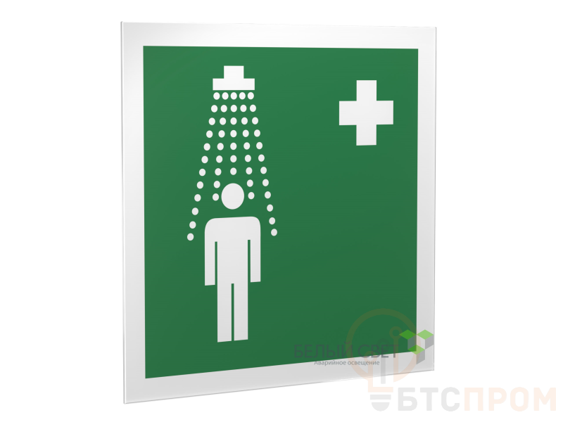 Знак безопасности "Пункт приема гигиенических процедур (душевые)", габаритные размеры 150х161 мм, фактические размеры 150х150 мм, сигнальный цвет - зеленый, контрастный цвет - белый
