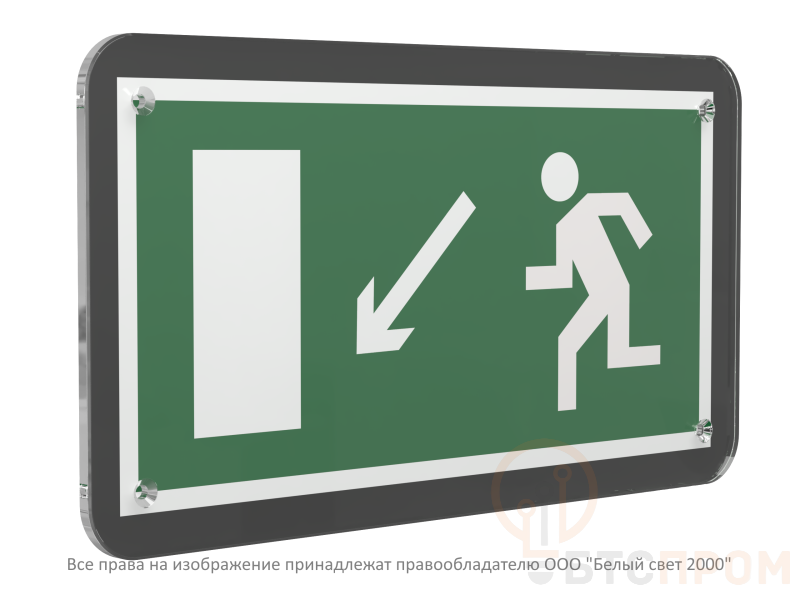 - Надпись: "Направление к эвакуационному выходу налево вниз"