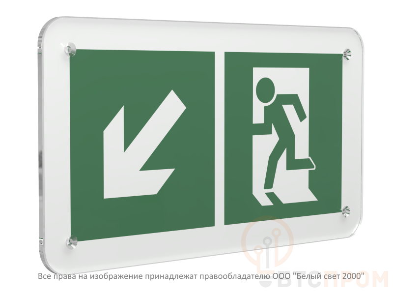 Основная сфера применения знака — размещение в общественных, коммерческих и производственных зданиях, таких как торговые центры, офисы, больницы, гостиницы, учебные заведения и промышленные объекты. Он монтируется на стенах коридоров и переходов для указания точного направления к эвакуационному выходу, особенно в случаях, когда путь лежит вниз по лестнице. Знак изготовлен из прочных материалов, устойчивых к воздействию влаги, пыли и умеренных механических нагрузок, что гарантирует его долговечность. Источником подсветки служат светодиоды белого света, обеспечивающие равномерную и яркую засветку, хорошо видимую даже в условиях задымления. Знак соответствует требованиям нормативных документов и предназначен для круглосуточного использования в системах аварийной эвакуационной сигнализации.