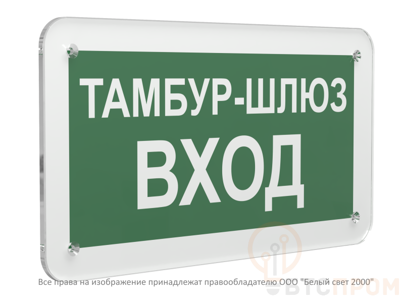 Основные характеристики знака: графическое обозначение «вход в тамбур-шлюз» выполнено в виде стилизованной фигуры человека на белом фоне, переходящего через дверной проем. Пиктограмма и стрелка-указатель имеют зеленый цвет. Корпус знака изготовлен из прочного самозатухающего пластика ПВХ, что обеспечивает его долговечность и стойкость к воздействию внешней среды. Для подсветки в нерабочее время или при отключении электроэнергии используется белая световозвращающая пленка, которая гарантирует хорошую видимость в любое время суток.