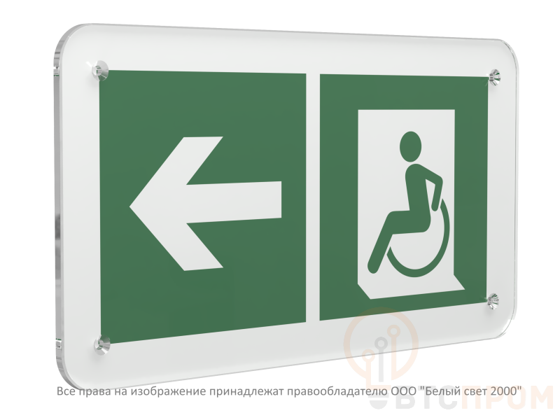 Изделие изготовлено из прочных и долговечных материалов, устойчивых к износу и воздействию внешней среды. Лицевая сторона знака имеет четкое и контрастное изображение пиктограммы бегущего человека, стрелки, указывающей направление влево, и символа инвалидной коляски. Надпись «ЭВАКУАЦИОННЫЙ ВЫХОД» и стилизованная стрелка выполняются в белом цвете на зеленом фоне, что обеспечивает высокую видимость и мгновенное распознавание даже в условиях задымления или недостаточной освещенности.