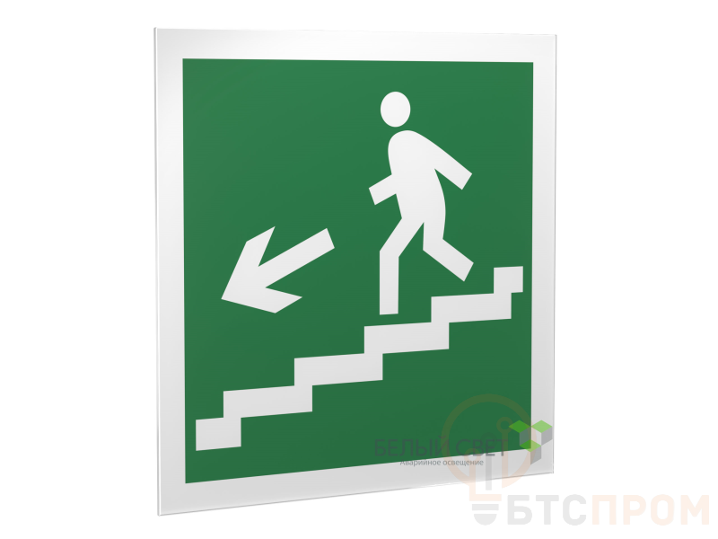 Знак безопасности "Направление к эвакуационному выходу по лестнице вниз", габаритные размеры 324х324 мм, фактические размеры 300х300 мм, сигнальный цвет - зеленый, контрастный цвет - белый