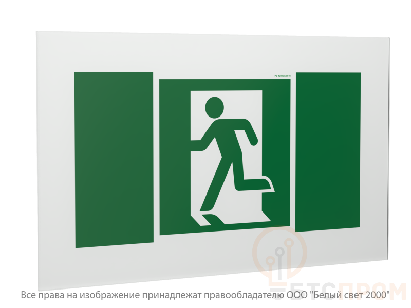 Знак имеет строго регламентированные размеры 200x100 мм и исполнение с белой пиктограммой и стрелкой на зеленом фоне. Для подсветки в условиях задымления или отключения электроэнергии используется внутренняя светодиодная подсветка белого света, обеспечивающая яркое и равномерное свечение. Знак работает от источника постоянного тока 12/24 В или переменного тока 220 В, что позволяет легко интегрировать его в любую систему аварийного освещения. Он предназначен для монтажа на левой стороне по отношению к направлению движения к выходу.