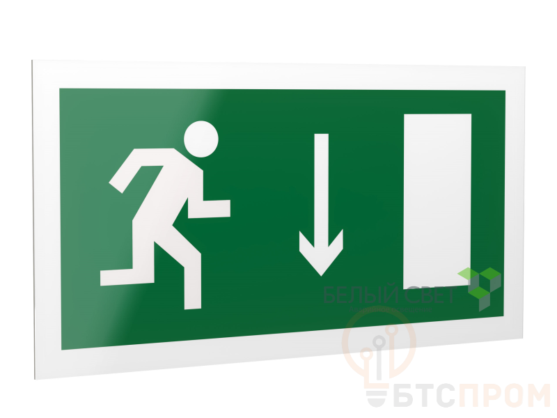 Знак безопасности "Указатель двери эвакуационного выхода (правосторонний)", габаритные размеры 490х290 мм, фактические размеры 400х200 мм, сигнальный цвет - зеленый, контрастный цвет - белый