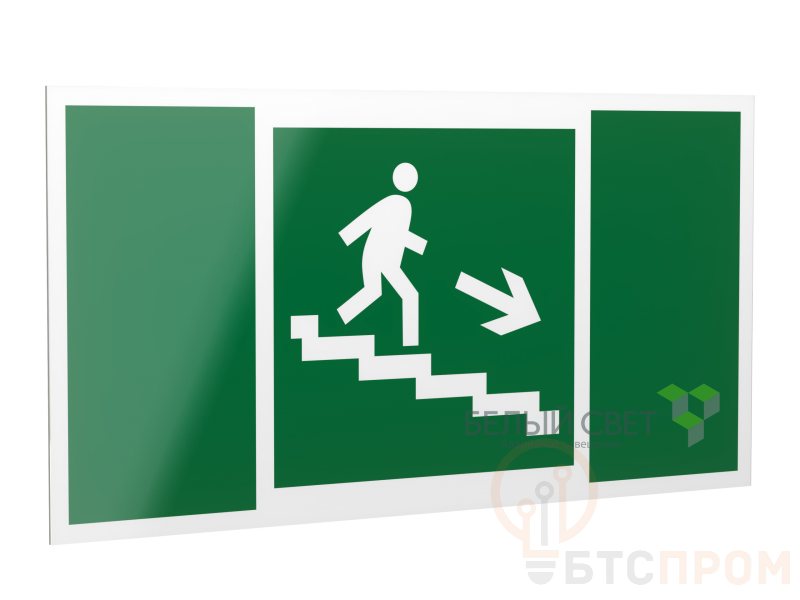 Знак безопасности "Направление к эвакуационному выходу по лестнице вниз", габаритные размеры 490х290 мм, фактические размеры 400х200 мм, сигнальный цвет - зеленый, контрастный цвет - белый
