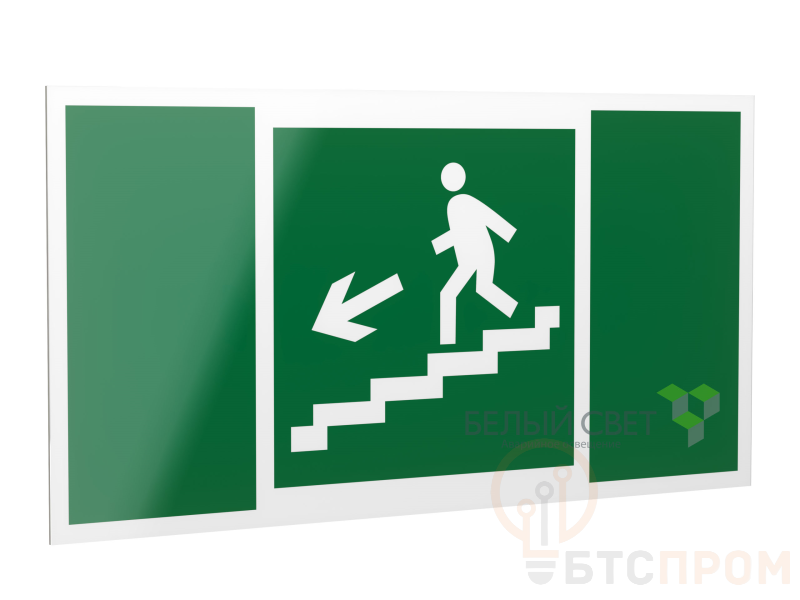 Знак безопасности "Направление к эвакуационному выходу по лестнице вниз", габаритные размеры 490х290 мм, фактические размеры 400х200 мм, сигнальный цвет - зеленый, контрастный цвет - белый