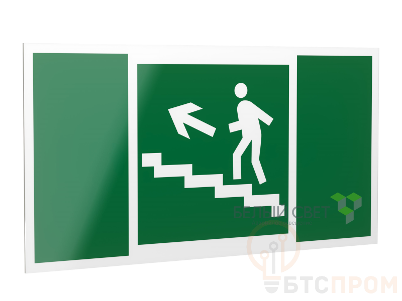 Знак безопасности "Направление к эвакуационному выходу по лестнице вверх", габаритные размеры 490х290 мм, фактические размеры 400х200 мм, сигнальный цвет - зеленый, контрастный цвет - белый