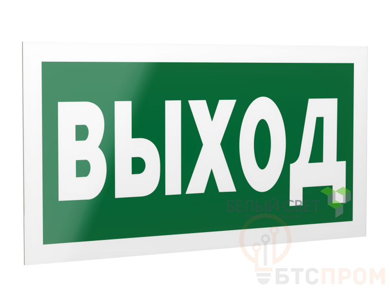 Знак безопасности "Выход", габаритные размеры 490х290 мм, фактические размеры 400х200 мм, сигнальный цвет - зеленый, контрастный цвет - белый