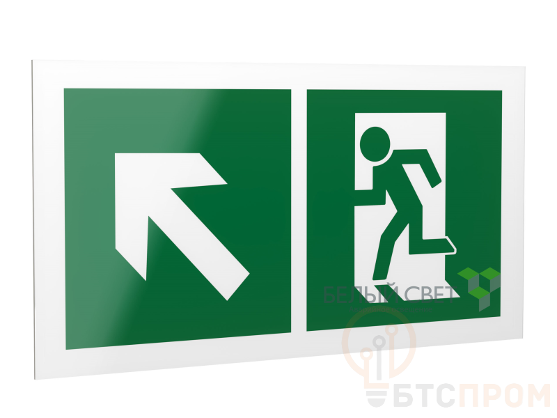 Знак безопасности "Направление к эвакуационному выходу налево вверх", габаритные размеры 490х290 мм, фактические размеры 400х200 мм, сигнальный цвет - зеленый, контрастный цвет - белый