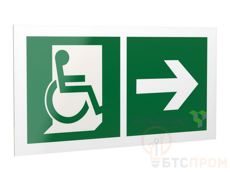 Знак безопасности "Направление движения к эвакуационному выходу МГН направо", габаритные размеры 490х290 мм, фактические размеры 400х200 мм, сигнальный цвет - зеленый, контрастный цвет - белый