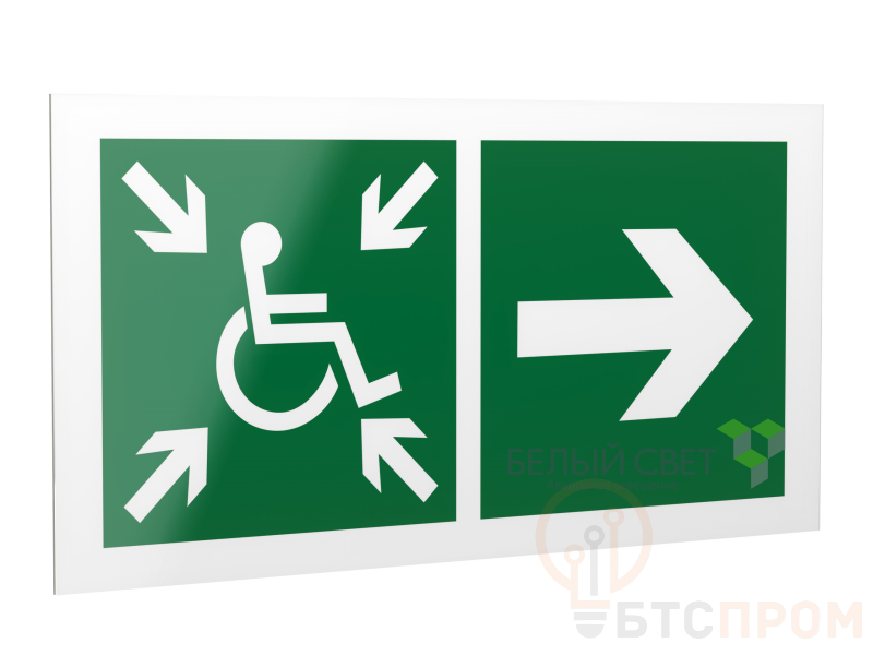 Знак безопасности "Направление движения к пункту сбора (безопасной зоне) МГН направо", габаритные размеры 490х290 мм, фактические размеры 400х200 мм, сигнальный цвет - зеленый, контрастный цвет - белый