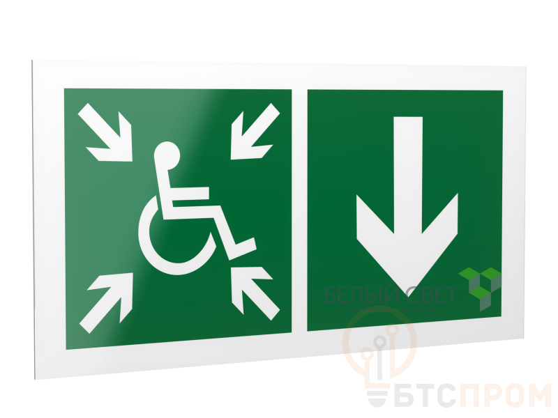 Знак безопасности "Указатель двери пункта сбора (безопасной зоны) МГН (правосторонний)", габаритные размеры 490х290 мм, фактические размеры 400х200 мм, сигнальный цвет - зеленый, контрастный цвет - белый