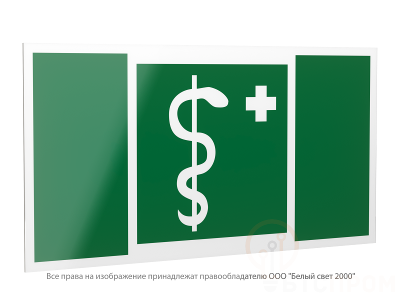 Знак выполнен в белом цвете с четкой черной пиктограммой и надписью, обозначающей медицинский кабинет. Символы и текст подсвечиваются равномерным белым светом за счет использования светодиодов, что гарантирует хорошую видимость в любое время суток.