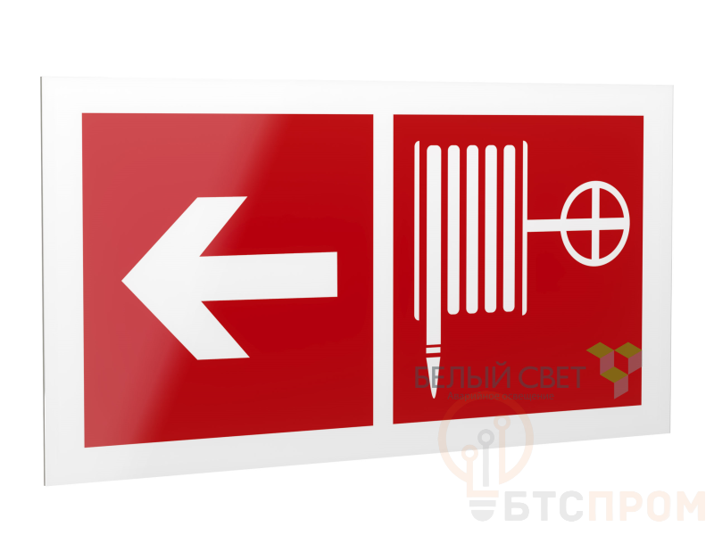 Знак безопасности "Указатель движения к пожарному крану налево", габаритные размеры 490х290 мм, фактические размеры 400х200 мм, сигнальный цвет - красный, контрастный цвет - белый