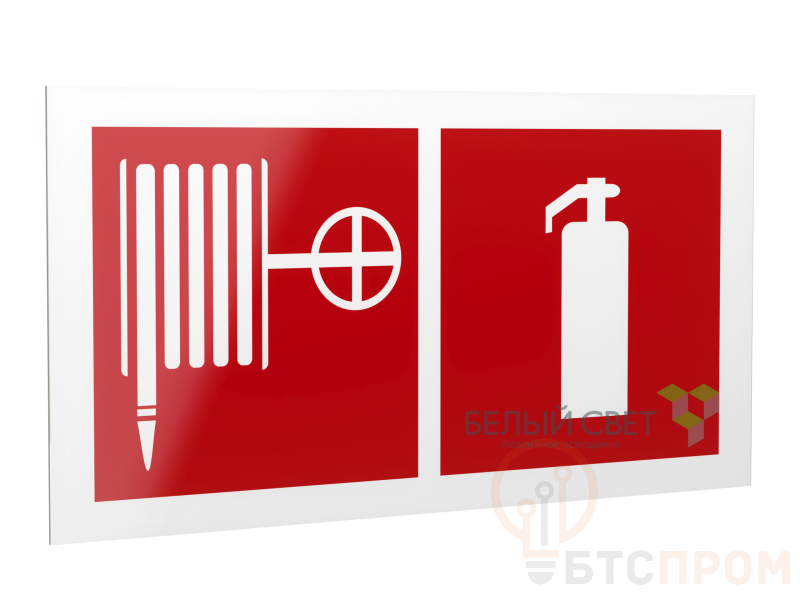Знак безопасности "Пожарный кран и огнетушитель", габаритные размеры 490х290 мм, фактические размеры 400х200 мм, сигнальный цвет - красный, контрастный цвет - белый