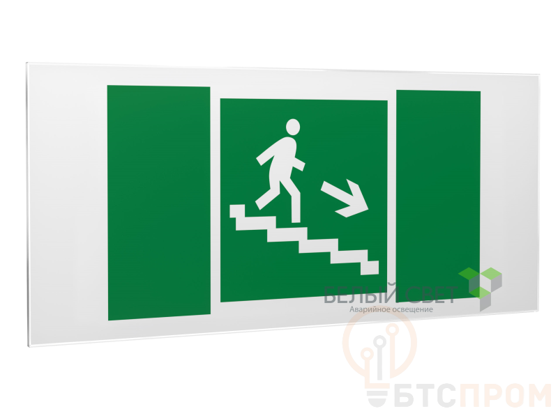 Знак безопасности "Направление к эвакуационному выходу по лестнице вниз", габаритные размеры 545х235 мм, фактические размеры 400х200 мм, сигнальный цвет - зеленый, контрастный цвет - белый