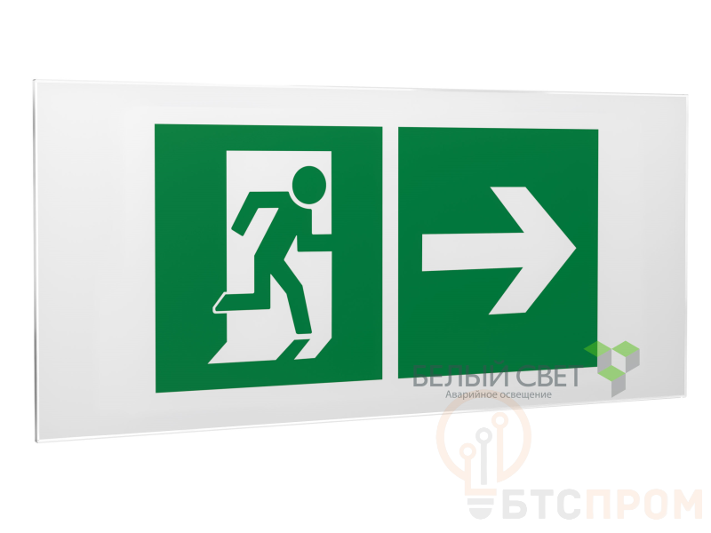 Знак безопасности "Направление к эвакуационному выходу направо", габаритные размеры 545х235 мм, фактические размеры 400х200 мм, сигнальный цвет - зеленый, контрастный цвет - белый