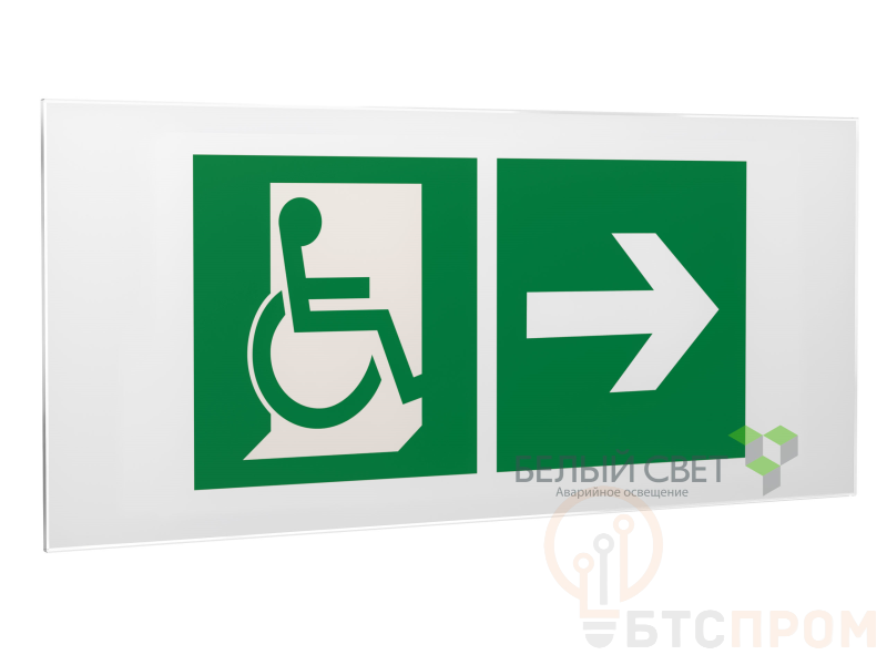 Знак безопасности "Направление движения к эвакуационному выходу МГН направо", габаритные размеры 545х235 мм, фактические размеры 400х200 мм, сигнальный цвет - зеленый, контрастный цвет - белый