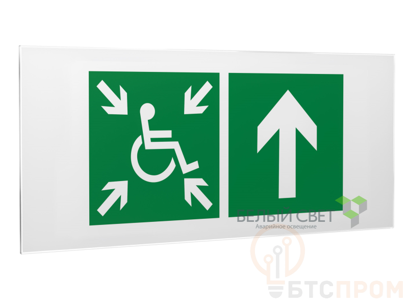 Знак безопасности "Направление движения к пункту сбора (безопасной зоне) МГН прямо", габаритные размеры 545х235 мм, фактические размеры 400х200 мм, сигнальный цвет - зеленый, контрастный цвет - белый