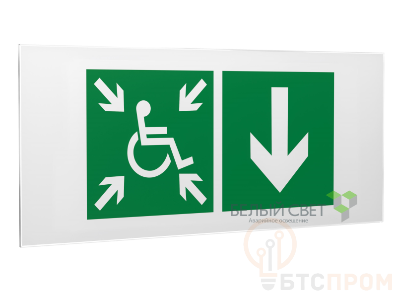 Знак безопасности "Указатель двери пункта сбора (безопасной зоны) МГН (правосторонний)", габаритные размеры 545х235 мм, фактические размеры 400х200 мм, сигнальный цвет - зеленый, контрастный цвет - белый