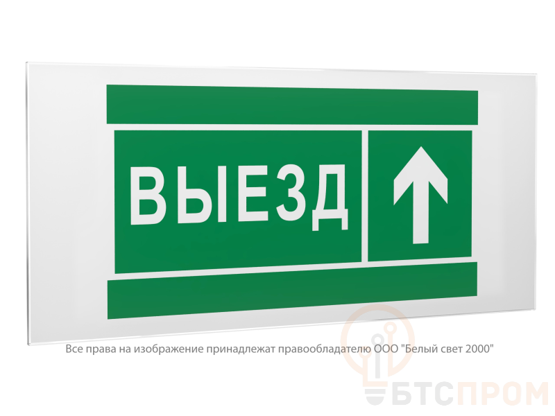 Знак выполнен в строгом соответствии с требованиями стандартов. Основной цвет таблички — белый, на который нанесена контрастная черная пиктограмма, изображающая направление движения прямо к символическим воротам. Для улучшения видимости в условиях недостаточной освещенности или задымленности знак изготавливается с использованием фотолюминесцентных материалов. Это позволяет ему накапливать свет от искусственных или естественных источников, а затем самостоятельно светиться в темноте белым светом, обеспечивая надежную идентификацию эвакуационного пути.