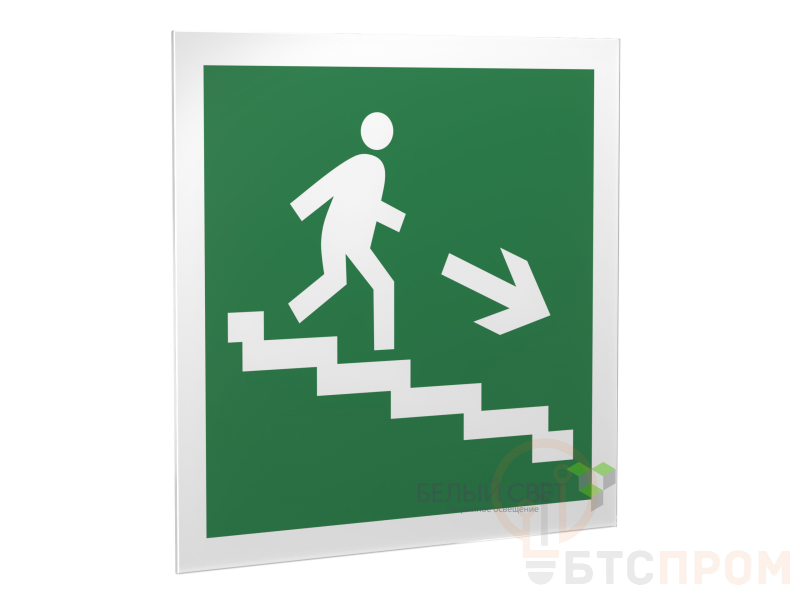 Знак безопасности "Направление к эвакуационному выходу по лестнице вниз", габаритные размеры 455х455 мм, фактические размеры 400х400 мм, сигнальный цвет - зеленый, контрастный цвет - белый