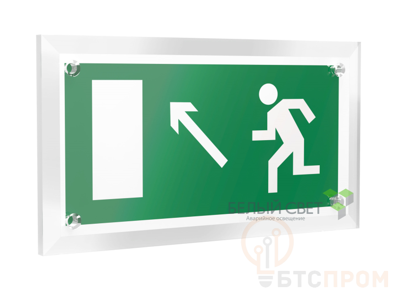 Знак безопасности "Направление к эвакуационному выходу налево вверх", габаритные размеры 220х120 мм, фактические размеры 200х100 мм, сигнальный цвет - зеленый, контрастный цвет - белый