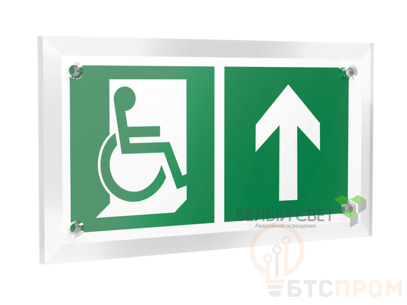 Знак безопасности "Направление движения к эвакуационному выходу МГН прямо", габаритные размеры 220х120 мм, фактические размеры 200х100 мм, сигнальный цвет - зеленый, контрастный цвет - белый