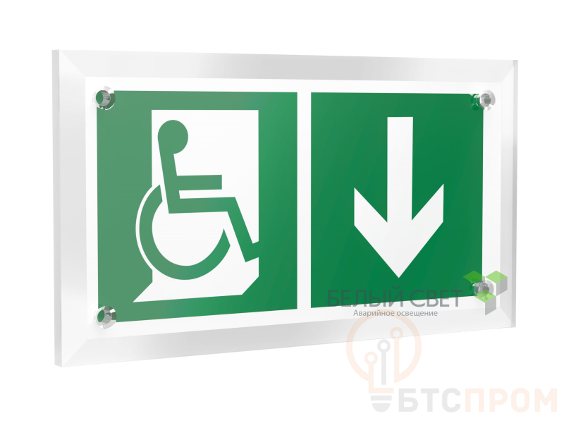 Знак безопасности "Указатель двери эвакуационного выхода (правосторонний) для МГН", габаритные размеры 220х120 мм, фактические размеры 200х100 мм, сигнальный цвет - зеленый, контрастный цвет - белый