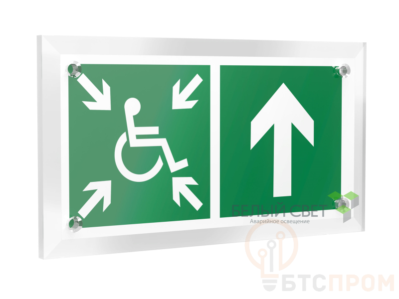Знак безопасности "Направление движения к пункту сбора (безопасной зоне) МГН прямо", габаритные размеры 220х120 мм, фактические размеры 200х100 мм, сигнальный цвет - зеленый, контрастный цвет - белый
