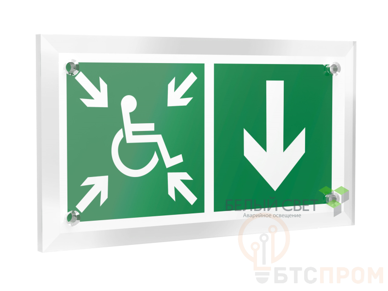 Знак безопасности "Указатель двери пункта сбора (безопасной зоны) МГН (правосторонний)", габаритные размеры 220х120 мм, фактические размеры 200х100 мм, сигнальный цвет - зеленый, контрастный цвет - белый