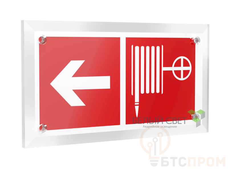 Знак безопасности "Указатель движения к пожарному крану налево", габаритные размеры 220х120 мм, фактические размеры 200х100 мм, сигнальный цвет - красный, контрастный цвет - белый