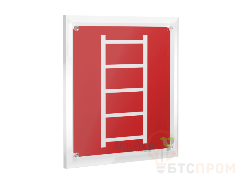 Знак безопасности "Пожарная лестница", габаритные размеры 172х172 мм, фактические размеры 150х150 мм, сигнальный цвет - красный, контрастный цвет - белый